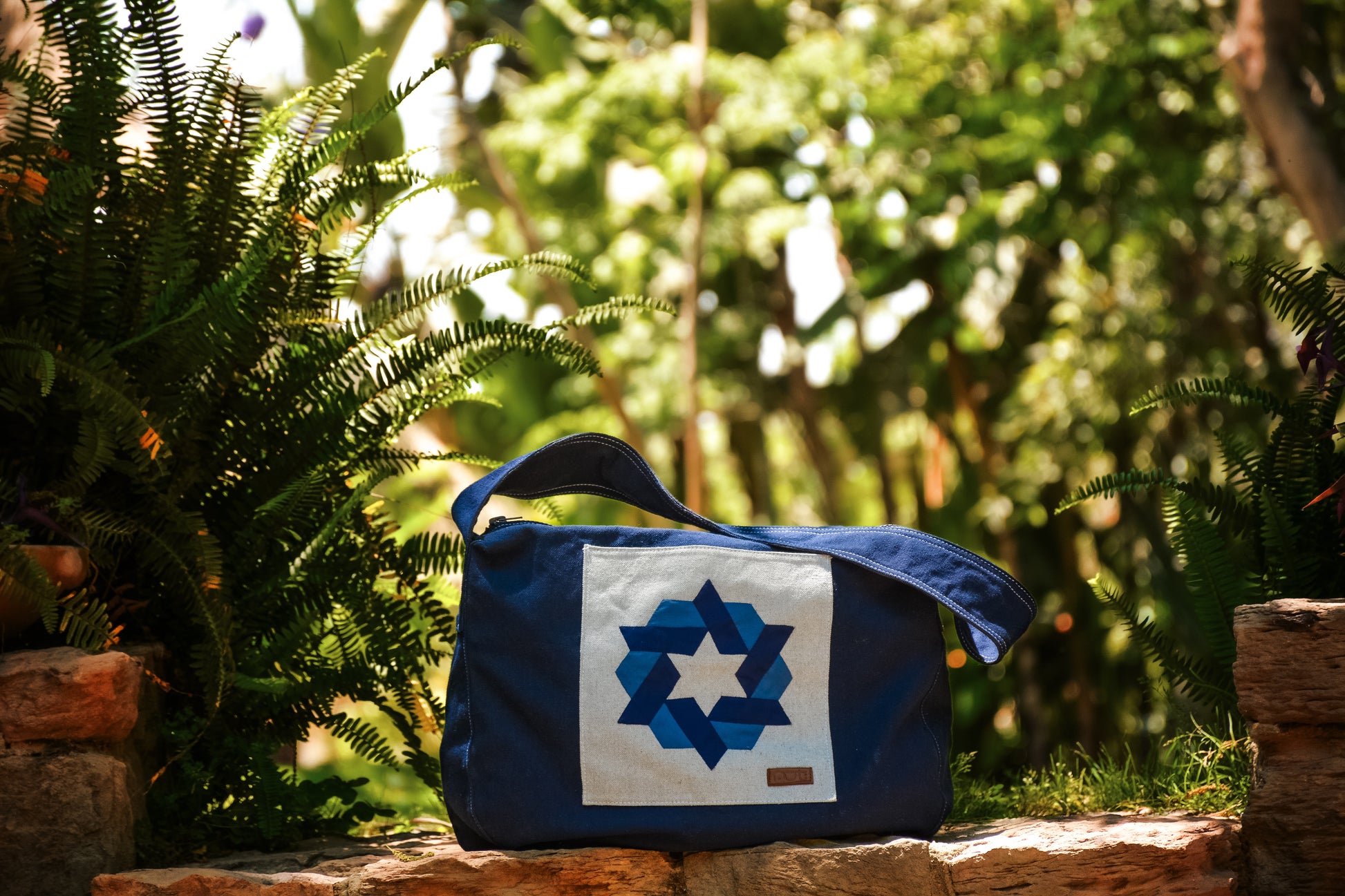 Canvas messenger/ travel bag with Khayamiya artwork on pocket. Closes with zipper and has inside zipper pocket.